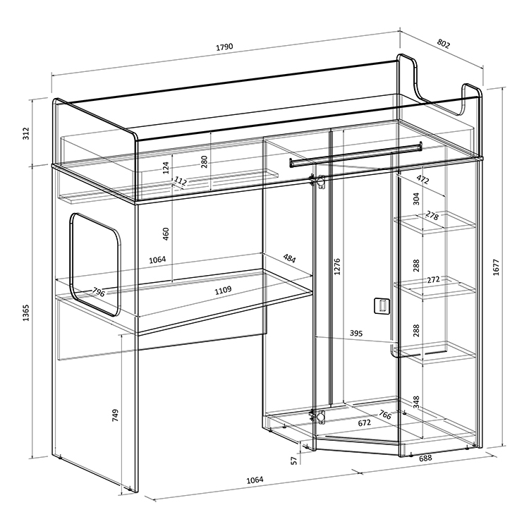 Высота кровати чердака всего 1677 мм.